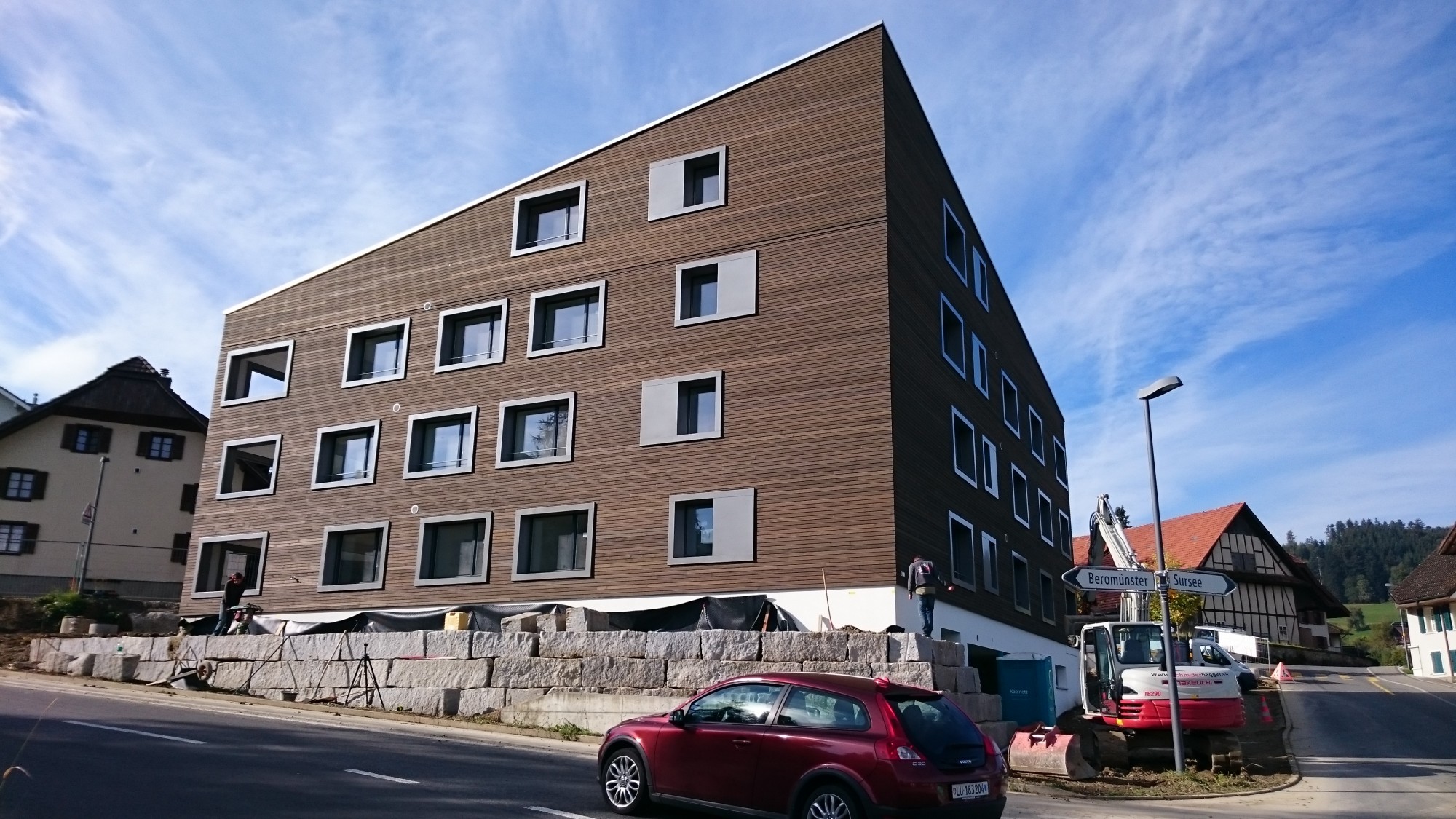 Im Dorfzentrum von Rickenbach auf dem Lindenplatz entsteht ein anspruchsvolles und in seiner Ausdrucksweise bestechendes Mehrfamilienhaus. Die allseitig durch Strassen begrenzte und stark abfallende Dreiecksparzelle hat das Projekt formal geprägt.