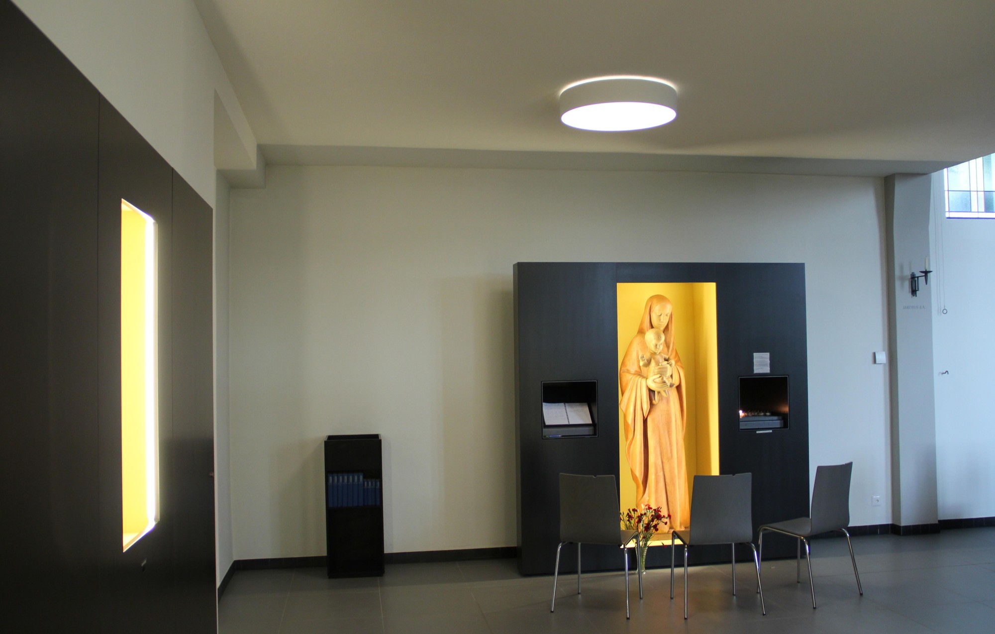 Durch eine rote Stufenplattform und die neuen Altarelementen wurde der Zeremoniebereich optisch gestärkt. Schriftenstände, Opferlichtständer und Fürbittenbuchablage bilden zusammen eine Andachtszone im Eingangsbereich. Maria und Josef erhalten dabei einen gebührenden Platz. Durch die Neugestaltung wurde eine positive Ausstrahlung mit einer gewissen Frische und Leichtigkeit erreicht.