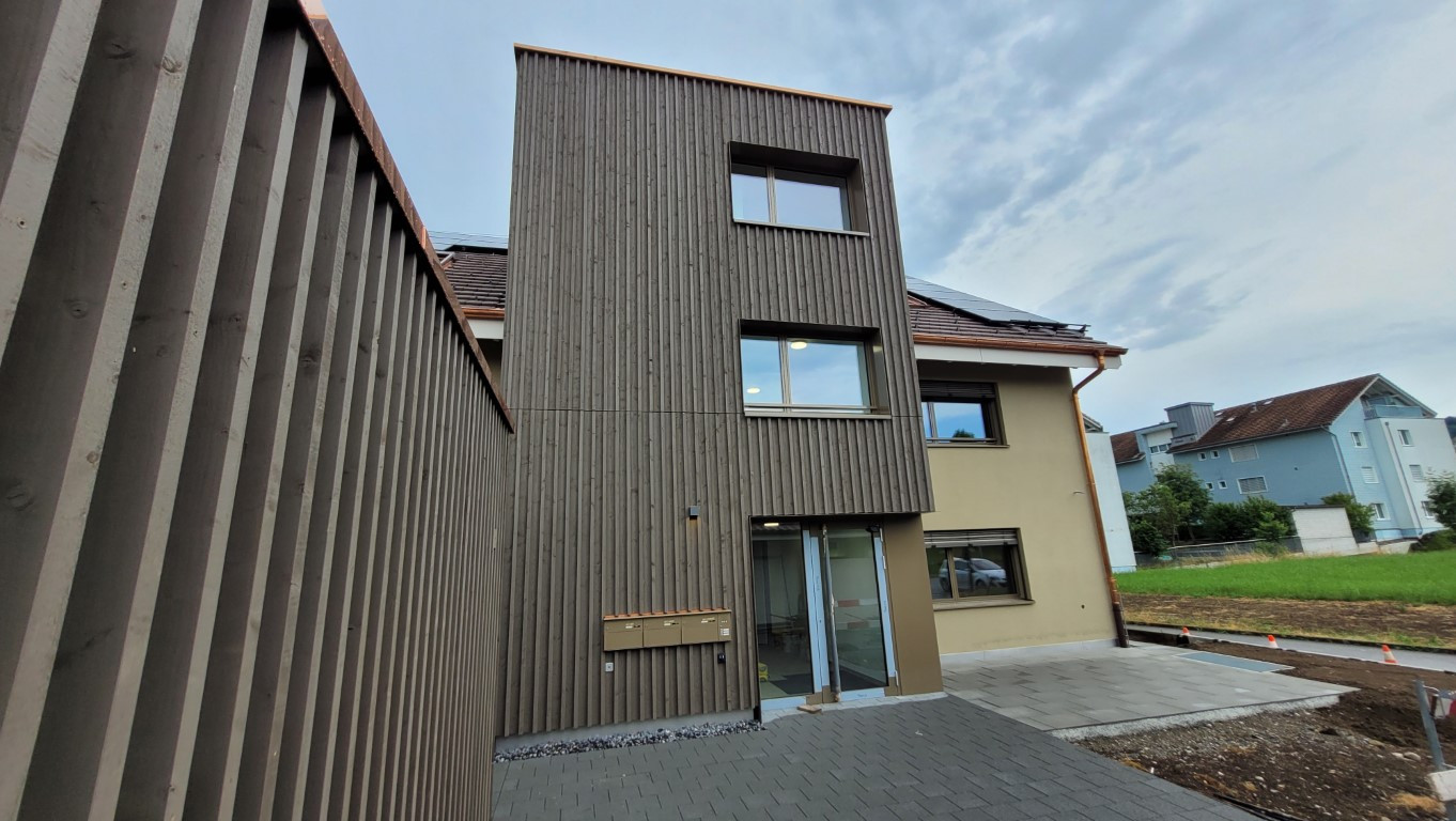 Das bestehende Bürogebäude wird in ein Wohnhaus mit 3 Eigentumswohnungen umgebaut. Zwei Anbauten erweitern das Gebäude mit Balkone und einem Lift. Zeitgleich erfolgt die energetische Sanierung des Nachbargebäudes und der Ersatz der bestehenden Ölheizung durch eine Wärmepumpe für das ganze Quartier.