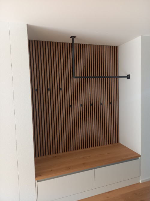 Die beiden Anbauten mit Lift und Balkone sowie ein neuer Carport sind ähnlich gestaltet: Vertikale Holzlamellen in dunkelbrauner Farbe fügen das Gebäude gestalterisch zu einer Einheit zusammen und verleihen Leichtigkeit.