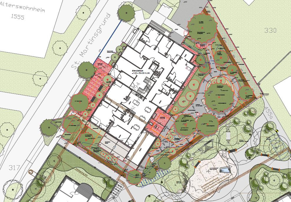 Im Zusammenhang mit der Überbauung der bestehenden Gewerbefläche mit zwei Neubauten auf dem Nachbargrundstück an der Münsterstrasse und dem St. Martinsgrund wird auch der Demenzgarten des Alterszentrums St. Martinsgrund den aktuellen Bedürfnissen der Bewohner angepasst.