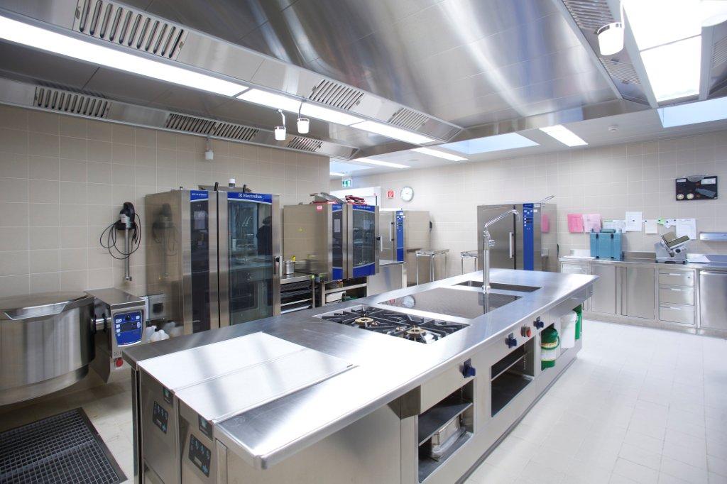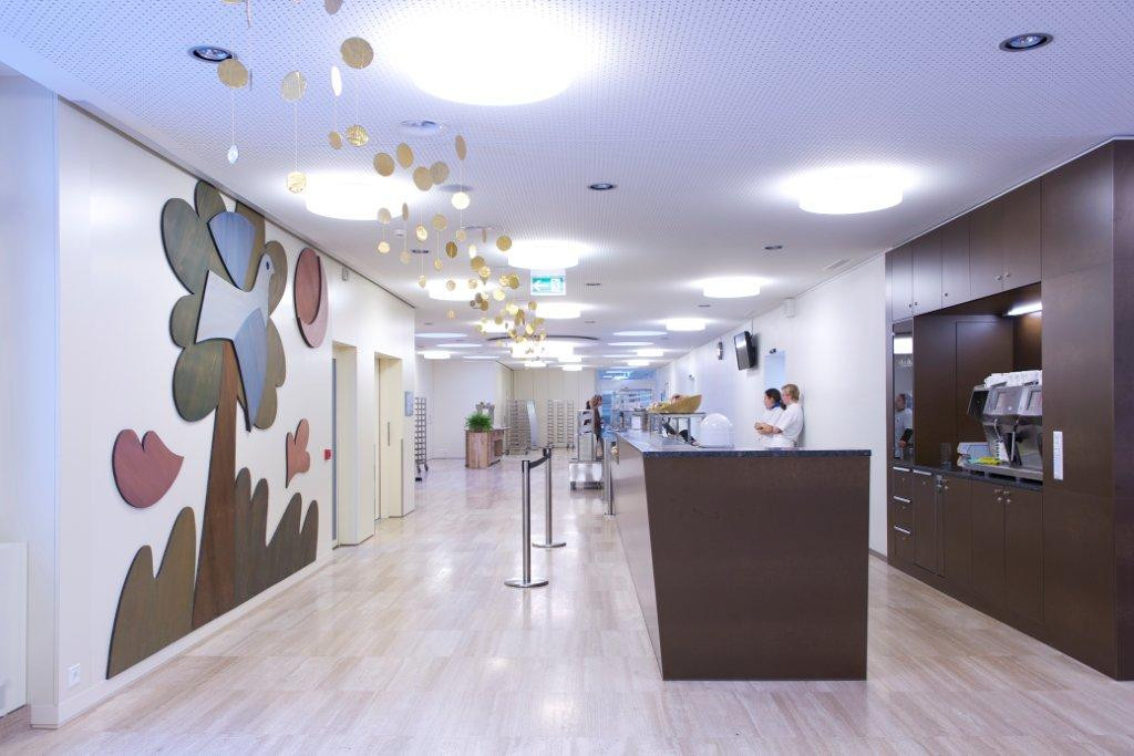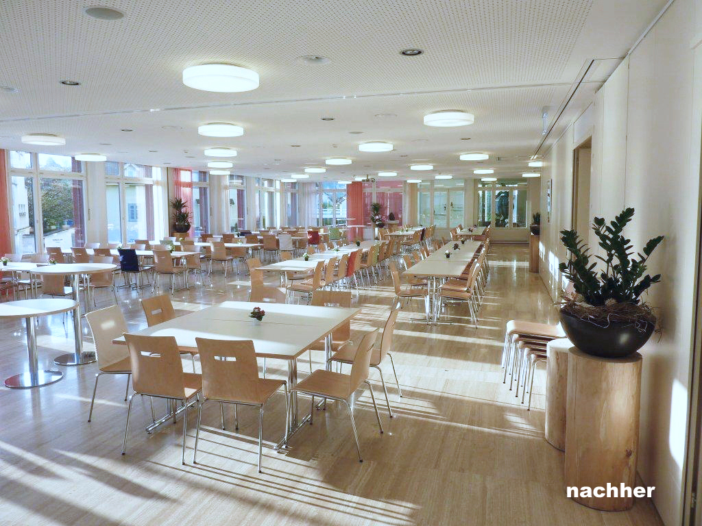 Die unterteilbaren Säle bieten Platz für insgesamt 200 Personen. Die Essensausgabetheke und der angrenzende Cafeteriabereich mit Terrasse sind Teil der Begegnungszone. Die Küche wird neu im „Cook and Chill“ – System betrieben und völlig neu konzipiert.