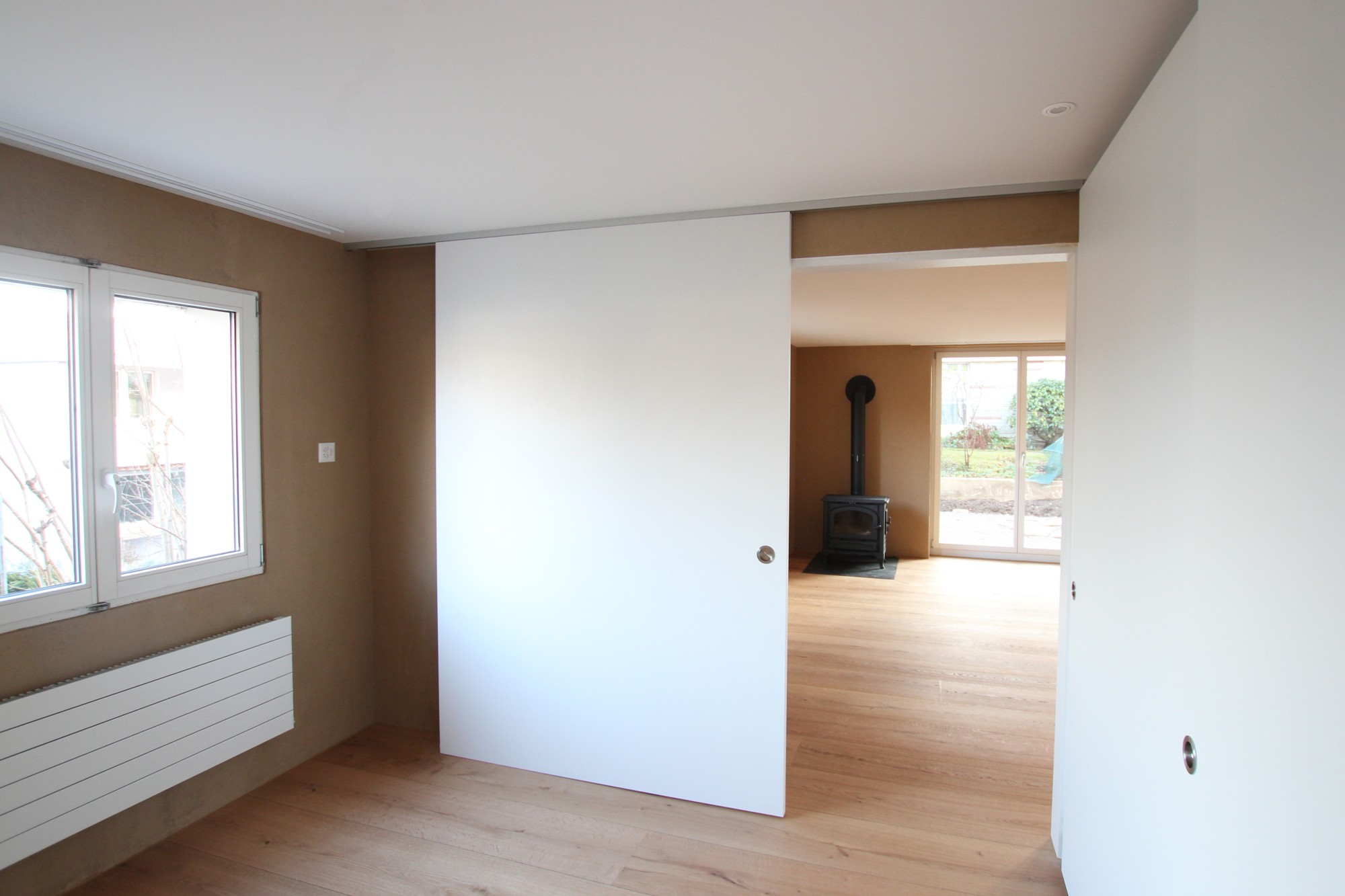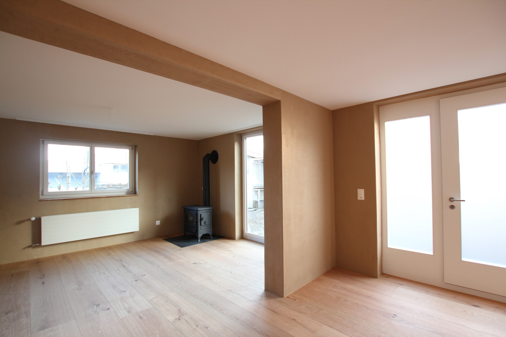 Es entstand eine gemütliche 2.5-Zi-Wohnung mit eigenem Gartenzugang. Zur Behaglichkeit trägt massgeblich der in Erdfarben gehaltene Lehmputz, ein gusseisernes Cheminée und der gebürstete Eichenparkett bei.